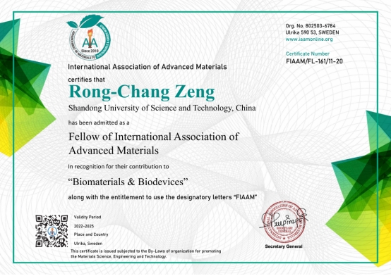 11月7日,国际先进材料学会(International Association of Advanced Materials,IAAM)在美国迈阿密举办的美国先进材料大会(American Advanced Materials Congress)上授予jdb电子游戏官方网站材料科学与工程学院曾荣昌教授“国际先进材料学会会士”(FIAAM)称号,以表彰他在“生物材料与生物器件”领域所做出的突出贡献。曾荣昌教授受邀做了题为 “Advance in Corrosion and Surface Modification of Bio-Magnesium and its Alloys”(生物镁合金腐蚀和表面改性进展)的在线大会特邀报告。