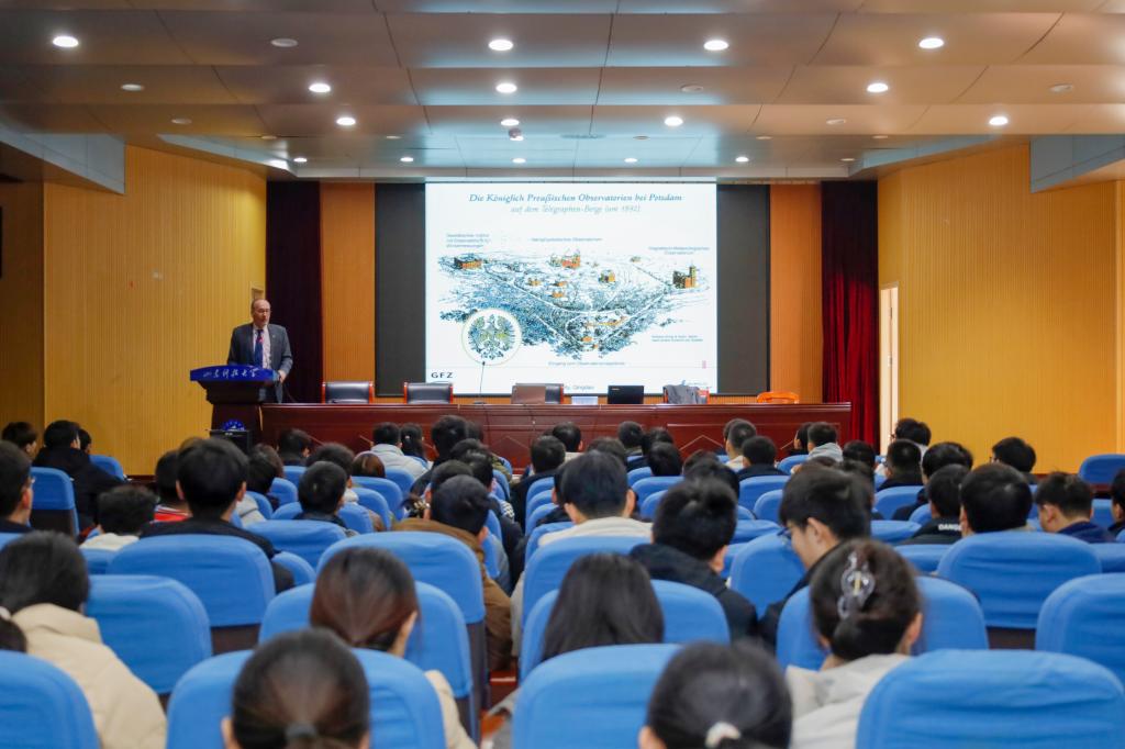 会谈后,Harald Schuh教授为测绘学院师生作题为“Geodetic Research at GFZ Potsdam”的专题报告。他介绍了GFZ大地测量的主要研究方向,报告了空间大地测量技术反演地球重力场、海面高、地球自转参数等的研究进展,并对未来的研究方向提出了看法,回答了师生提问。